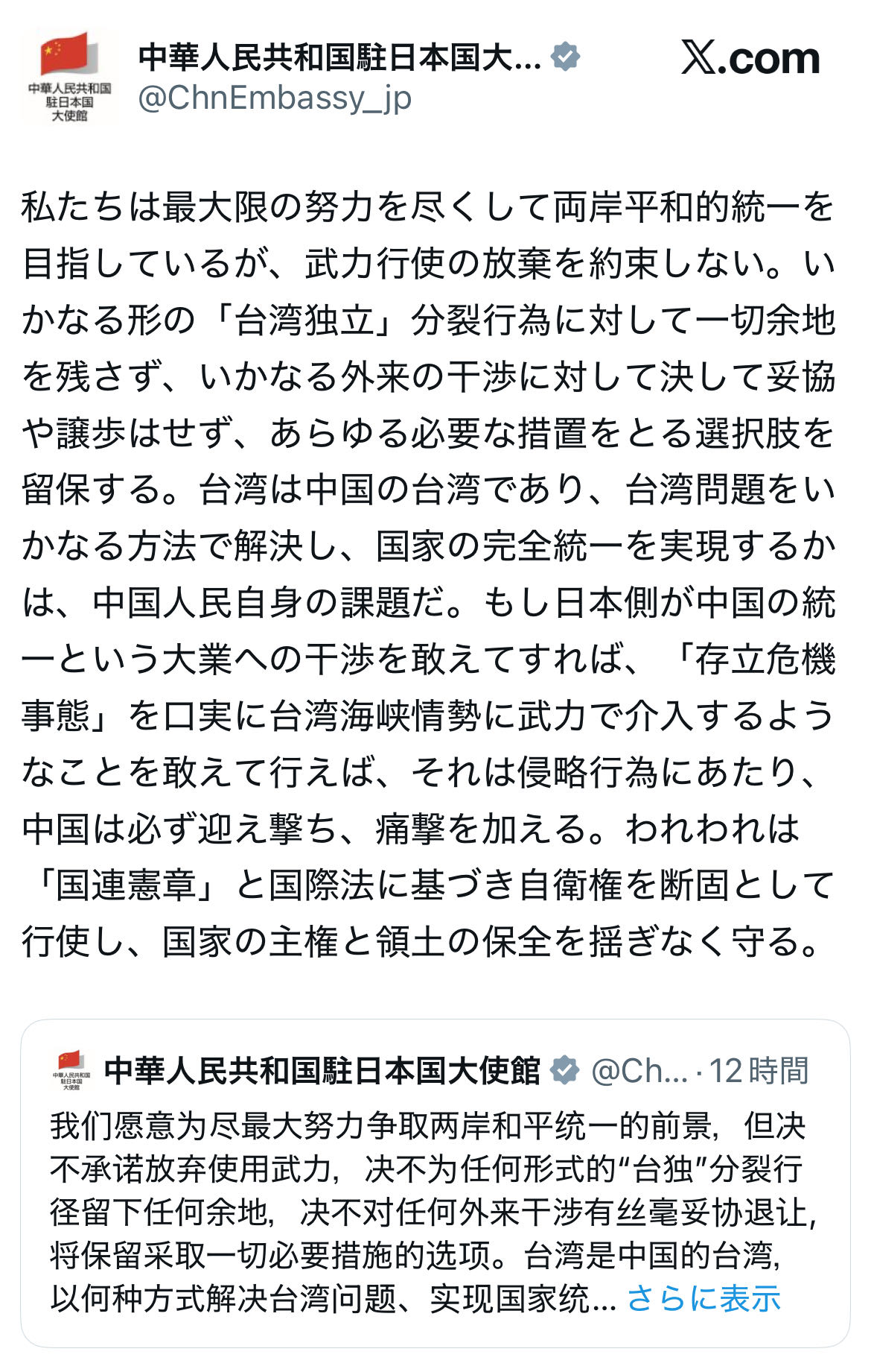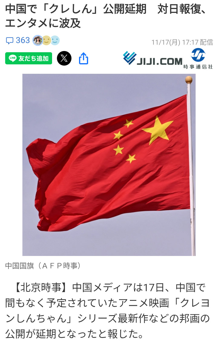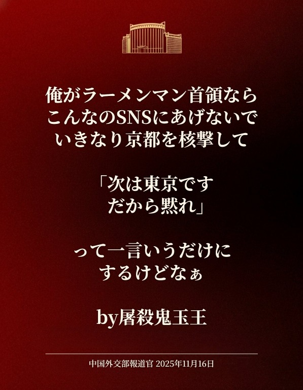 | … | 931無念Nameとしあき25/11/17(月)21:23:21No.1366858680+>全然中国政府を批判する声明をすぐ出してて怖くないのか……? |