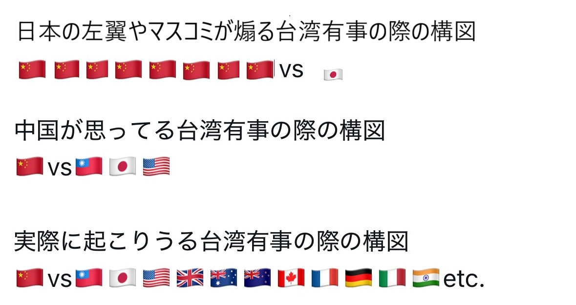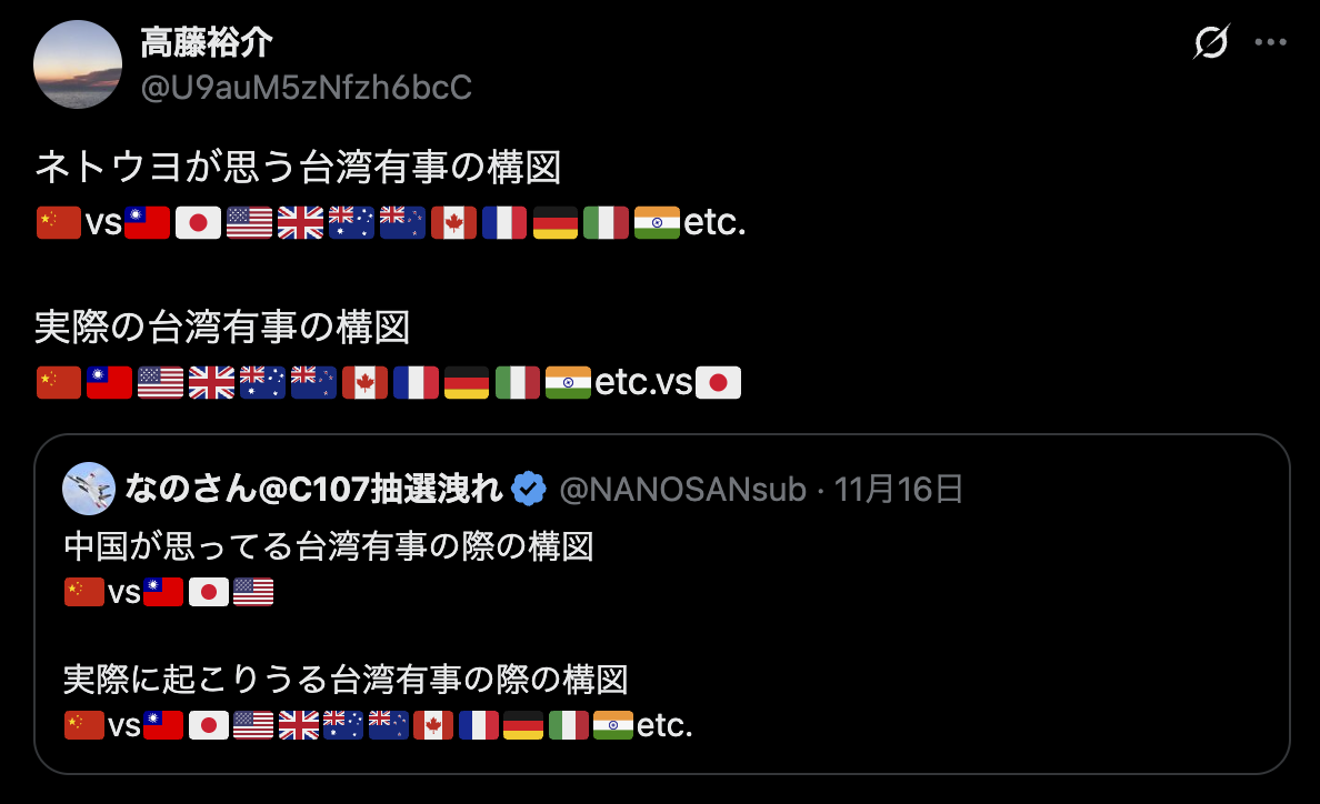 | … | 927無念Nameとしあき25/11/17(月)21:23:06No.1366858596そうだねx1台湾は日本と共にいるってポスト流れてきたわ |