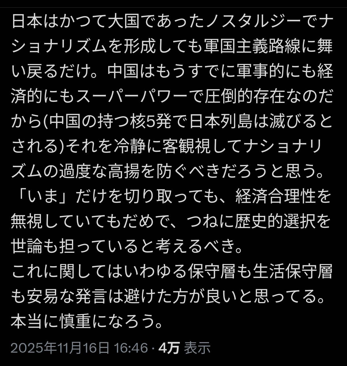 | … | 88無念Nameとしあき25/11/17(月)20:01:15No.1366835015そうだねx1>なんか中国の機嫌を取り続ければ戦争回避できると思ってる人いるよな |