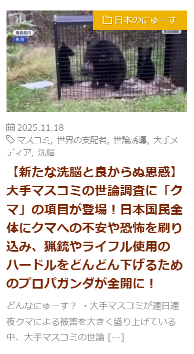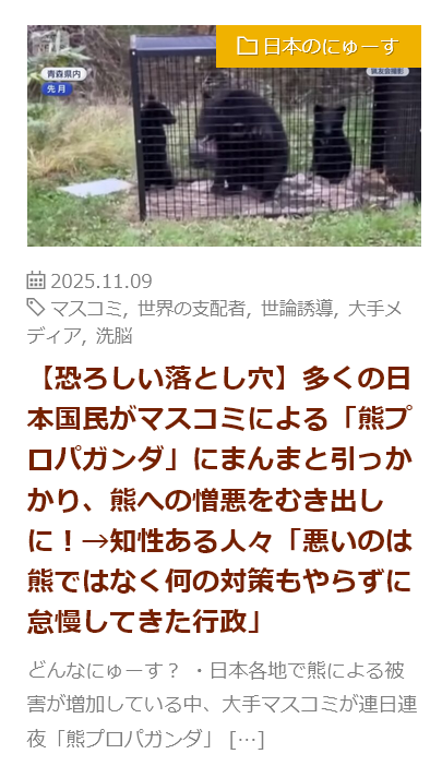 | … | 11無念Nameとしあき25/11/18(火)07:40:52No.1366927089そうだねx3>熊対策しなかったカス |