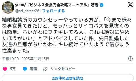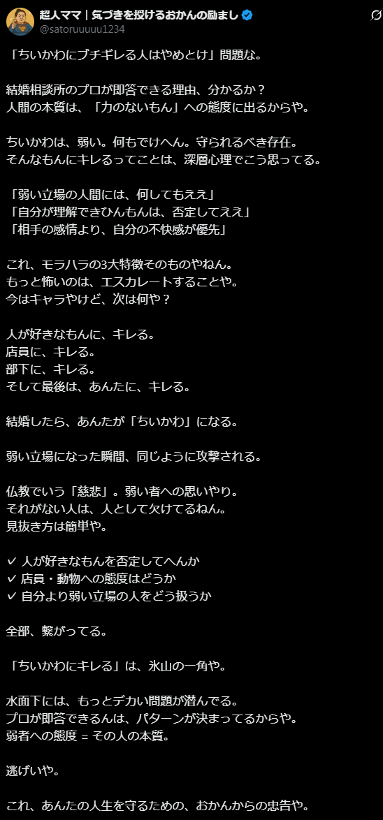 | … | 1無念Nameとしあき25/11/18(火)09:08:35No.1366935730そうだねx1結婚相談所のカウンセラーやっている方が、「今まで様々な男女見てきたけど、モラハラとサイコパスを見抜くのは簡単。ちいかわにブチギレてる人。これは絶対にやめたほうがいい」とアドバイスしていた件。先日離婚した友達の旦那がちいかわにキレ続けていたようで信ぴょう性高まった。 |