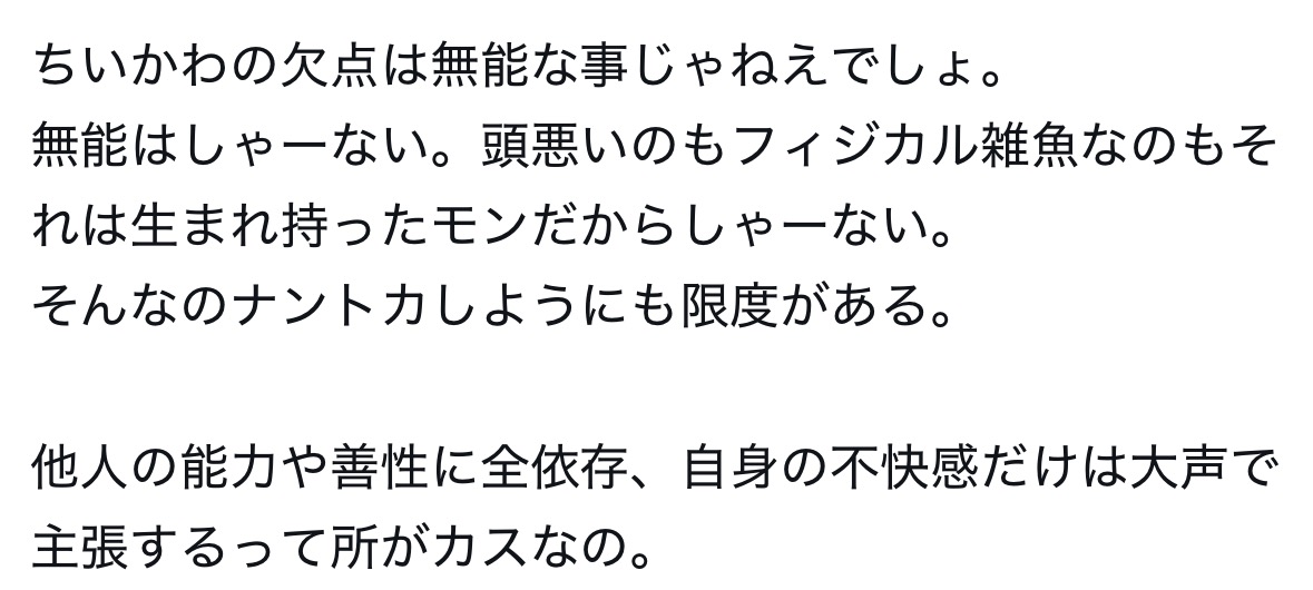 | … | 46無念Nameとしあき25/11/18(火)09:49:33No.1366940054そうだねx14>ちいかわ普段は弱い子だけどいざってときは腹くくって一番活躍するまであるけどそこガン無視してバチクソに叩く人いるよね |