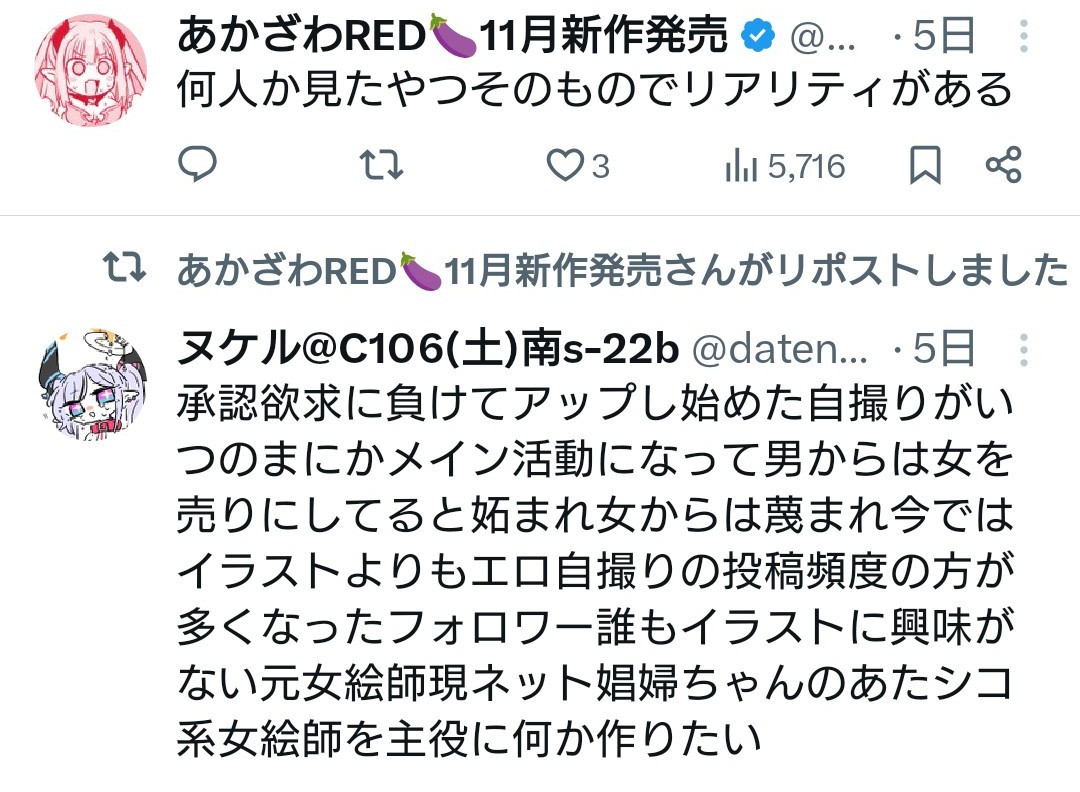 | … | 43無念Nameとしあき sage25/11/19(水)00:22:35 IP:144.91.*(lan-do.ne.jp)No.1367118562そうだねx1垢は売れないし、画業はもう無理っていう現実はよ見て |