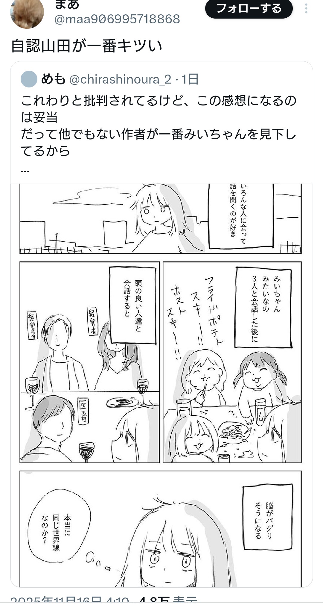 | … | 36無念Nameとしあき なの25/11/18(火)23:25:40 IP:202.89.*(bc9.ne.jp)No.1367107547+ 1763475940808.jpg-(193476 B) >本当にやることねえなら漫画描いてればいい |
