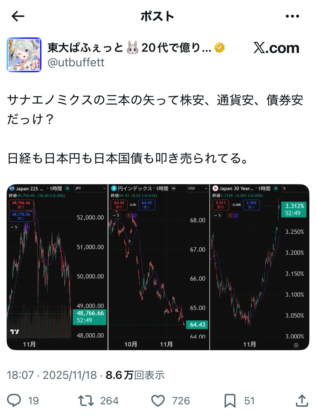 | … | 4無念Nameとしあき25/11/19(水)00:09:57No.1367116079そうだねx2>>「トリプル安」 |