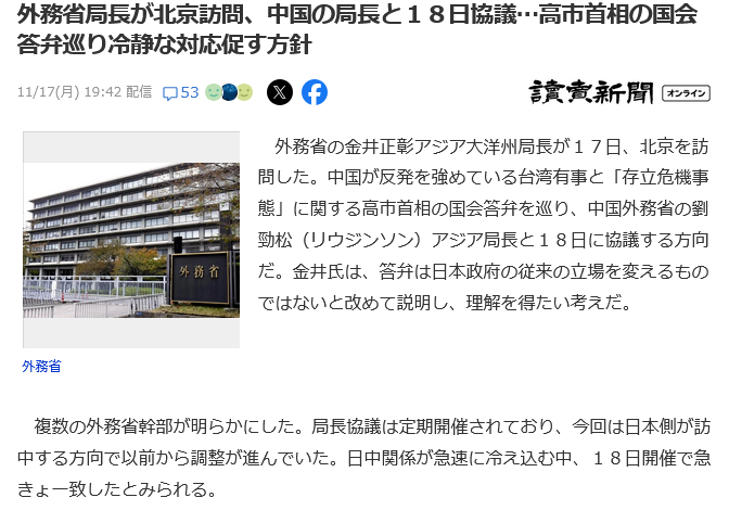 | … | 924無念Nameとしあき25/11/19(水)03:26:08No.1367137108そうだねx2とっくに外務省は折れて中国訪問したのに総理はファイティングスタイル続行なんでしょ? |