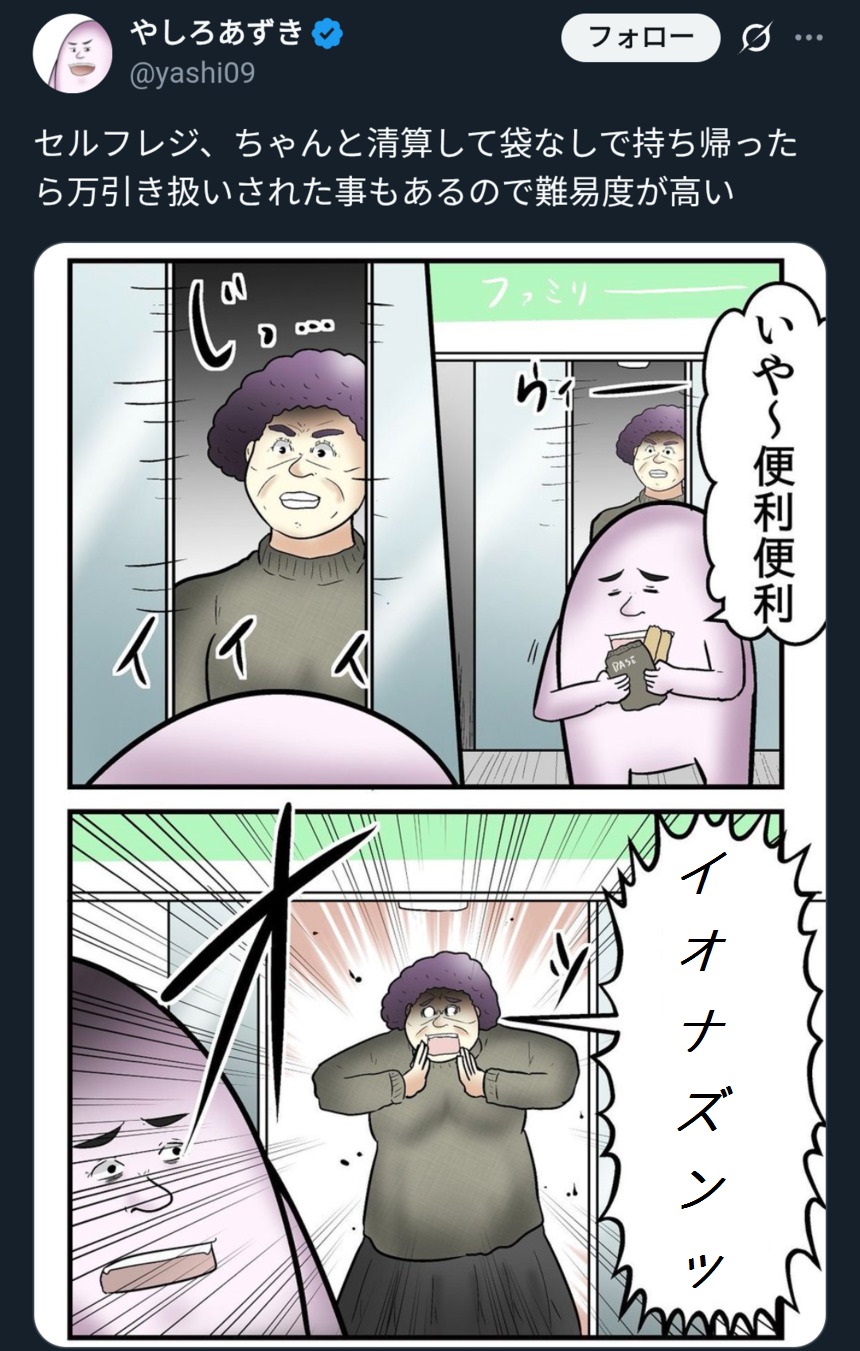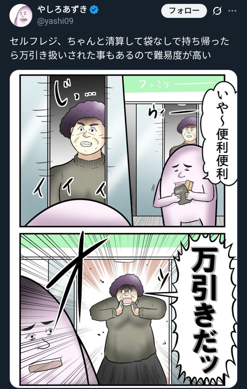 | … | 11無念Nameとしあき25/11/19(水)15:24:14No.1367215644+薄い本買ってレジでセンサーも外してもらって外出たらブザーが鳴って呼び止められた事はある |