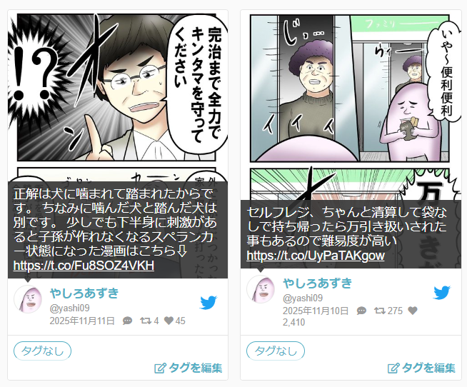 | … | 10無念Nameとしあき25/11/19(水)15:23:30No.1367215528+>めっちゃ漫画を乱発してるのなこいつ |