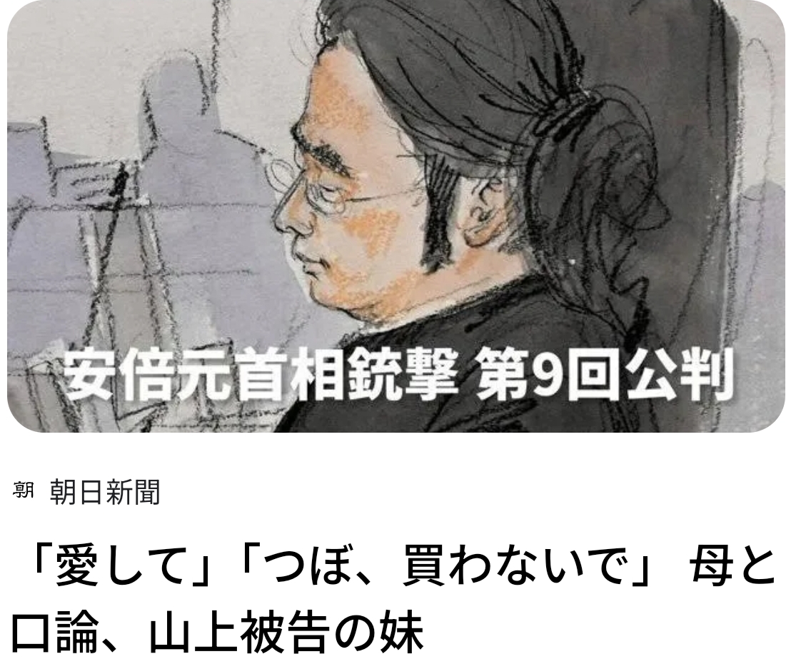 | … | 3無念Nameとしあき25/11/19(水)17:46:57No.1367240411そうだねx49【山上被告の妹】「母は毎朝、毎晩お祈りをしていた。夜中に縦長の半紙に作った見本みたいなのを見ながら、『日本が韓国に戦争で申し訳ないことをしてすみません』と何度も書いていた」 |