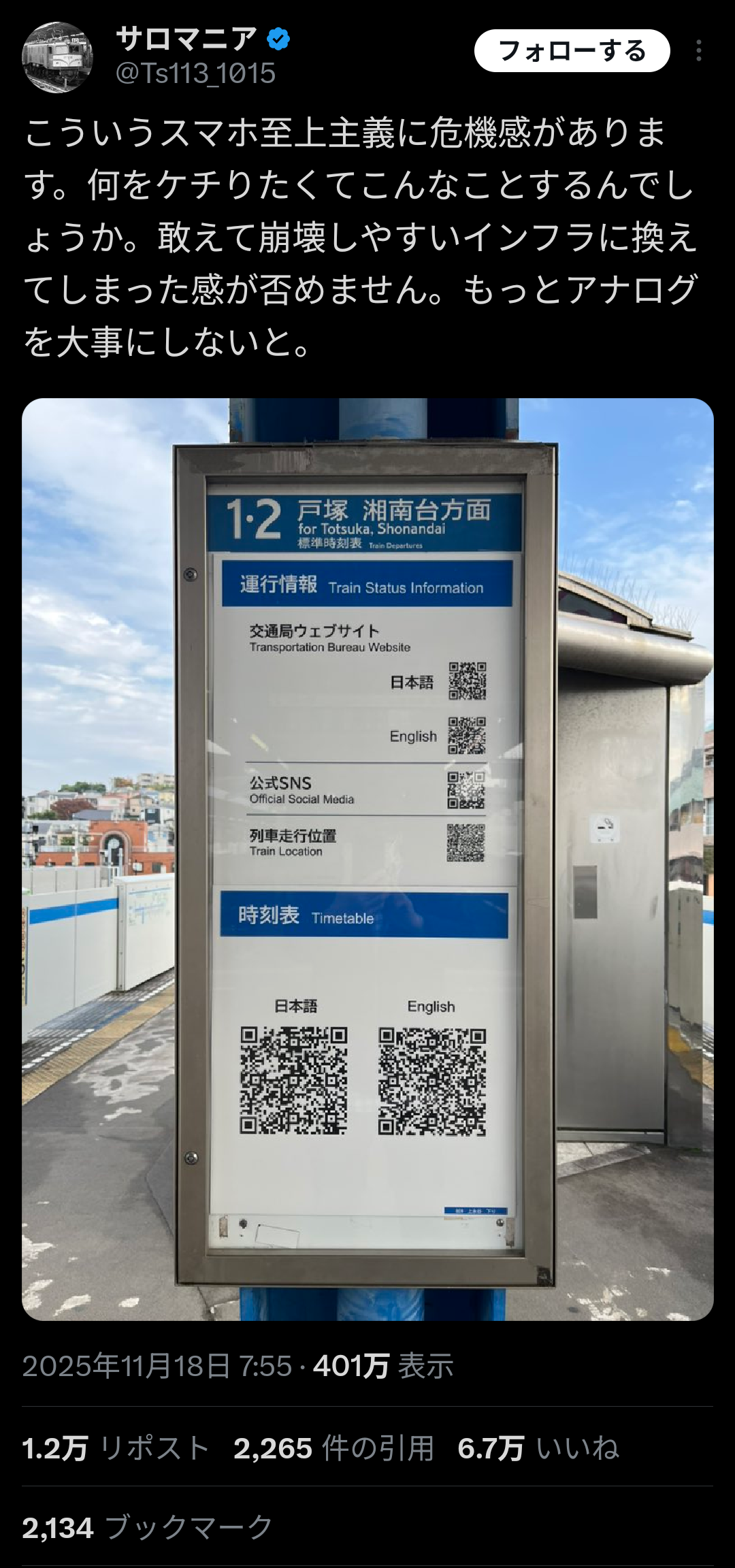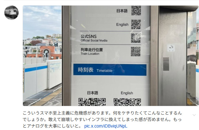 | … | 46無念Nameとしあき25/11/19(水)18:53:40No.1367255180+時刻表のとこだけ密度の高いQRが使われてるからURLでオンライン観覧するんではなく本当にそのものを表示するのかな? |