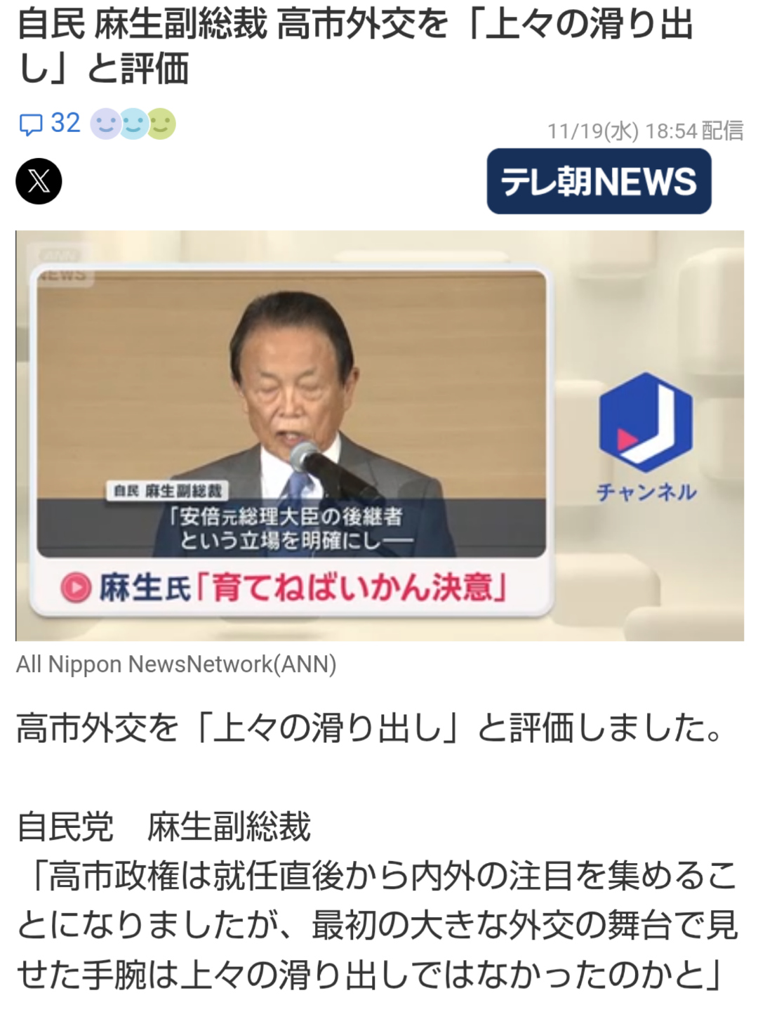| … | 23無念Nameとしあき25/11/19(水)19:09:27No.1367259201そうだねx22>早く辞めさせないと日中の関係最悪になるぞ |
