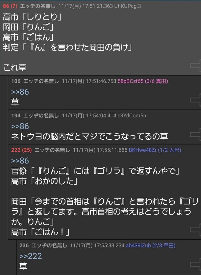 | … | 164無念Nameとしあき25/11/20(木)00:22:25No.1367344751+中國批判は分かるが岡田批判が高市擁護になるとは思えん |