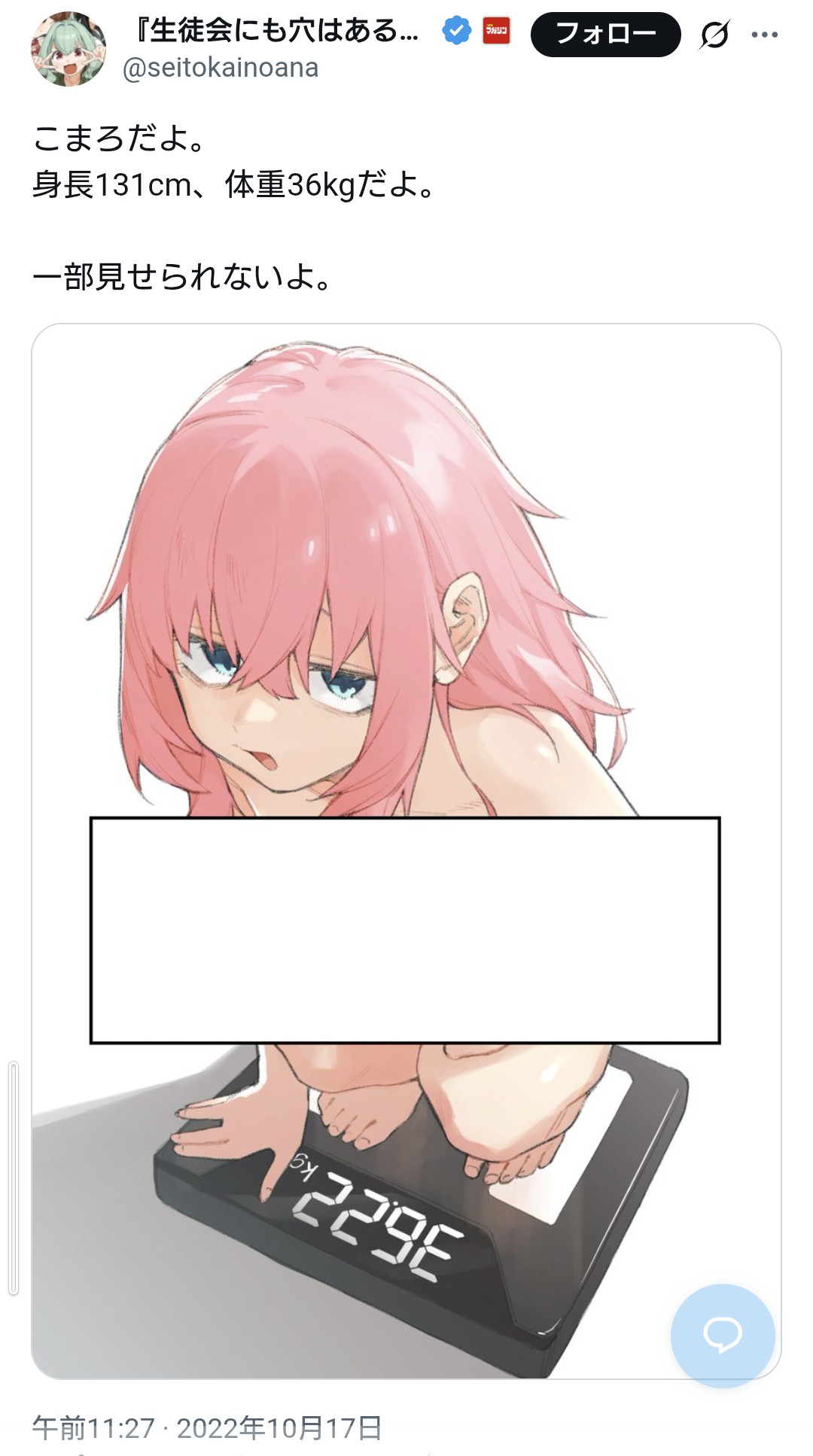 | … | 134無念Nameとしあき25/11/20(木)10:23:31No.1367391261+>131cmで43kgだと肥満らしいから仕方がないよね |