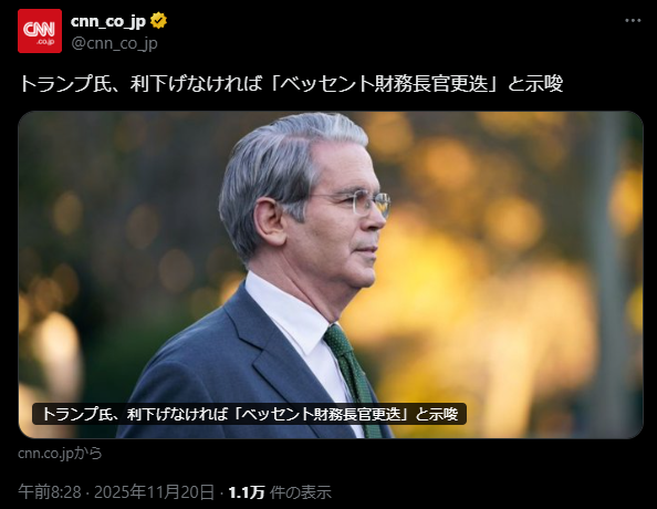 | … | 95無念Nameとしあき25/11/20(木)13:18:28 ID:SWIIXIIENo.1367420082そうだねx8 1763612308087.png-(245975 B) トランプ氏、利下げなければ「ベッセント財務長官更迭」と示唆 |