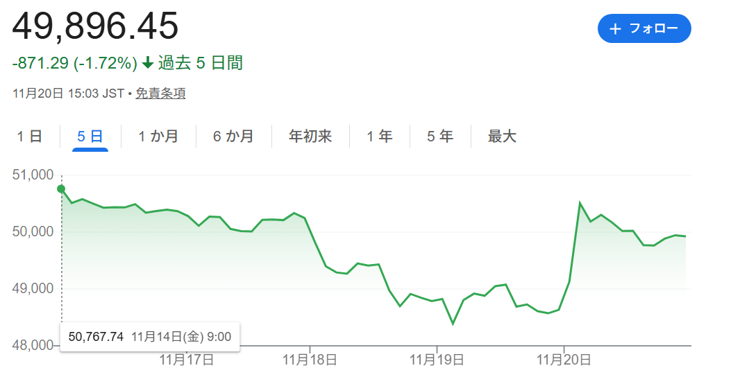 | … | 94無念Nameとしあき25/11/20(木)13:18:10 ID:hFmQQKzUNo.1367420026+なんか日経平均もTOPIXも垂れてきたので |