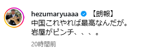 | … | 14無念Nameとしあき25/11/20(木)15:28:59No.1367439632そうだねx13>なんか中国さん大分混乱しとらんか? |