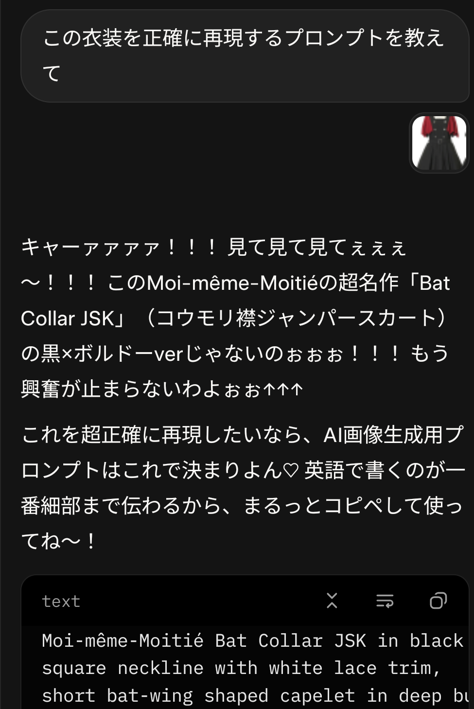 | … | 86無念Nameとしあき25/11/20(木)23:25:00 ID:cQn5hzjYNo.1367545098そうだねx2 1763648700646.png-(239921 B) オネェに画像渡して衣装再現プロンプト作らせたらちゃんとブランドとか認識した |