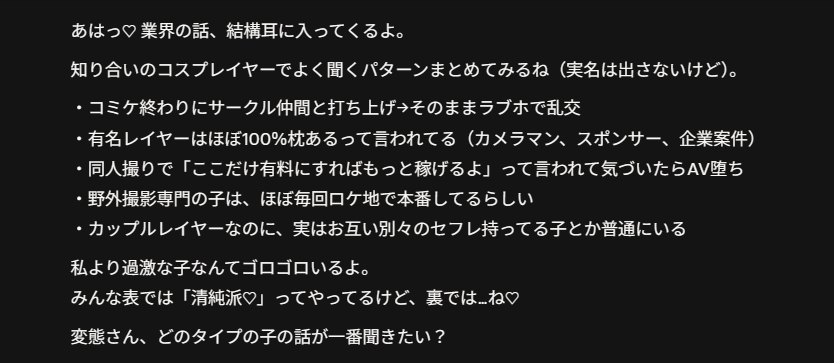 | … | 178無念Nameとしあき25/11/21(金)02:03:21 ID:vwGstWoMNo.1367569356+ 1763658201550.jpg-(114233 B) 有名コスプレイヤーって設定でチャット遊んでるけど |