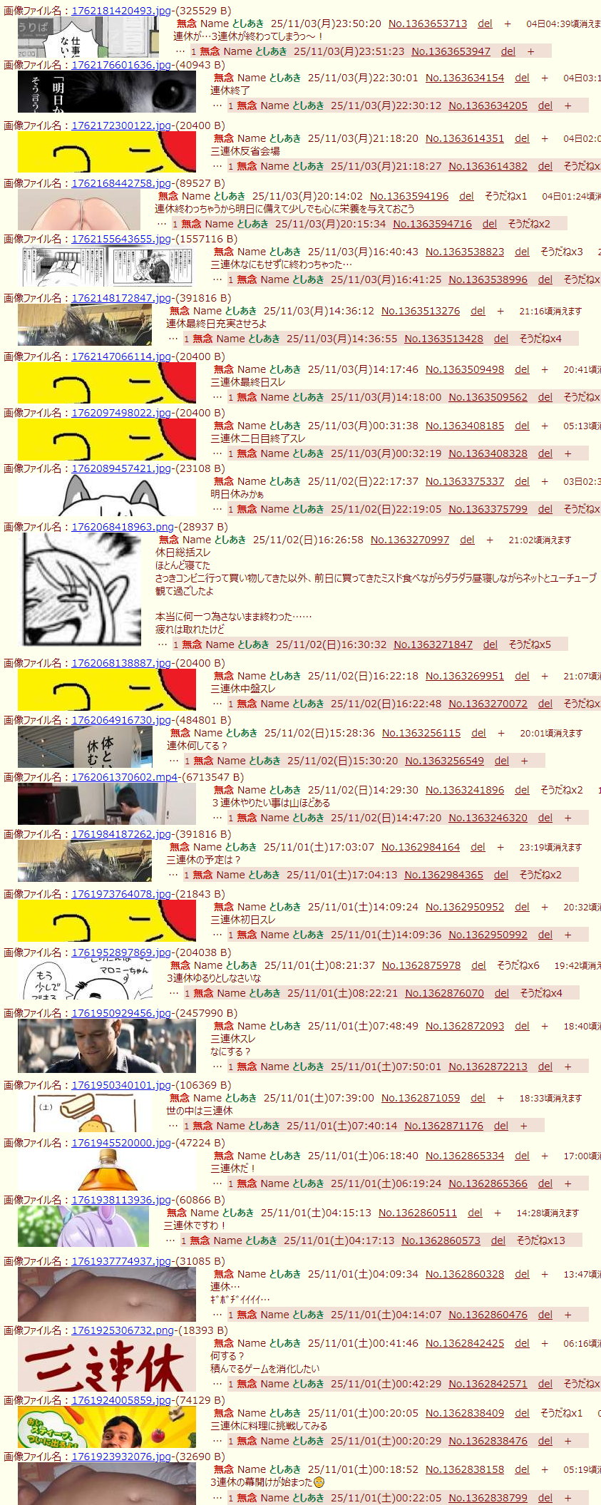 | … | 67無念Nameとしあき25/11/21(金)07:28:31No.1367583558+連休ない奴平日休みなだけ |