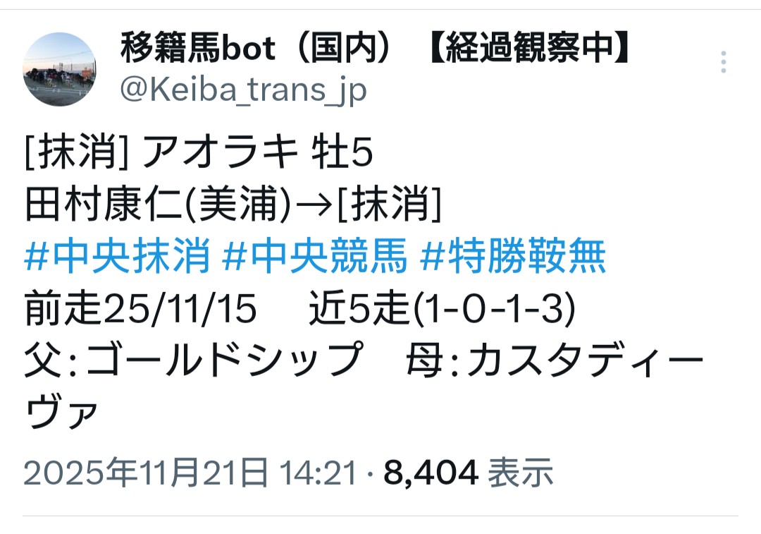 | … | 993無念Nameとしあき25/11/21(金)18:54:02No.1367687676+>>ジャパンカップの日の東京6レースでラヴズの産駒走るから応援よろしく! |