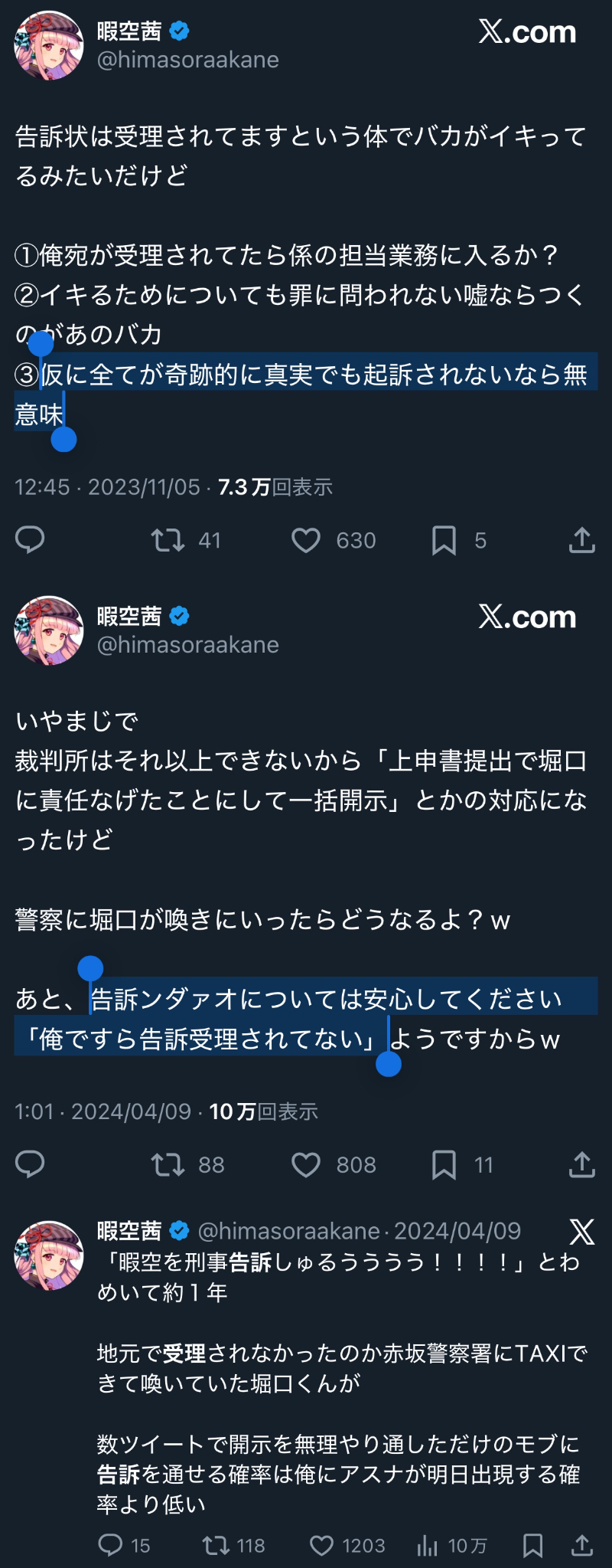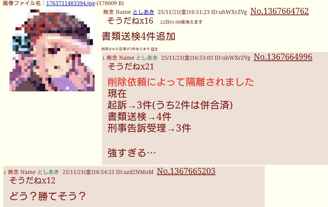 | … | 30無念Nameとしあき25/11/21(金)17:11:34 ID:uhWXrZVgNo.1367667968+堀口君のラインによると暇空の刑事告訴は10件 |