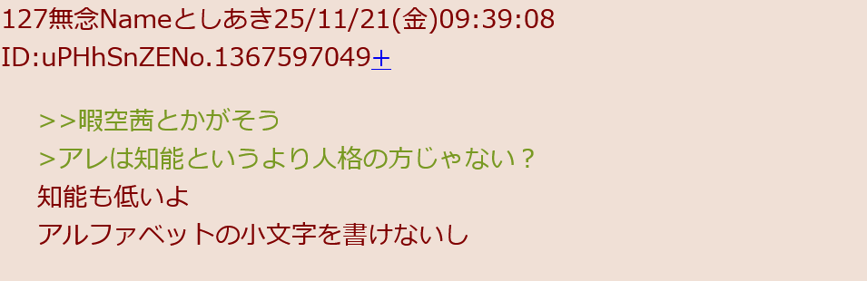 | … | 224無念Nameとしあき25/11/21(金)18:48:38 ID:wLWbS61QNo.1367686395+長い付き合いのあるもので無いとあのスレは把握できん |