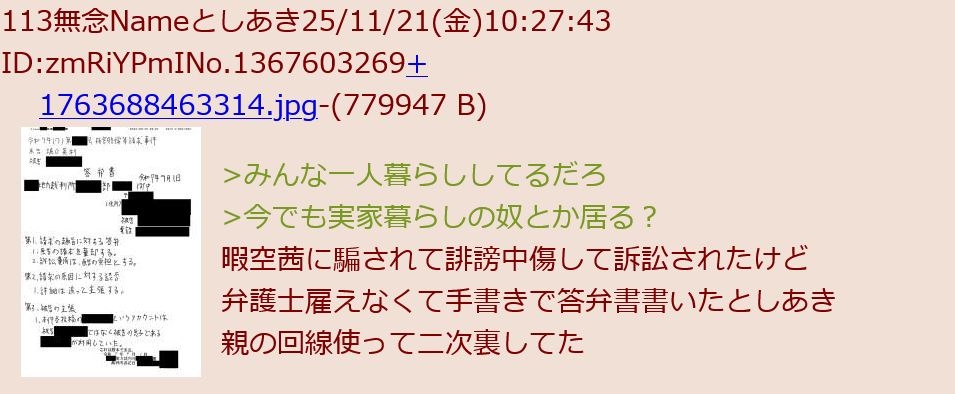 | … | 252無念Nameとしあき25/11/21(金)21:28:43 ID:cx0kP79ANo.1367729878+ 1763728123275.jpg-(3142276 B) >>>自演するのは暇アノンも夢アノンも一緒だな |