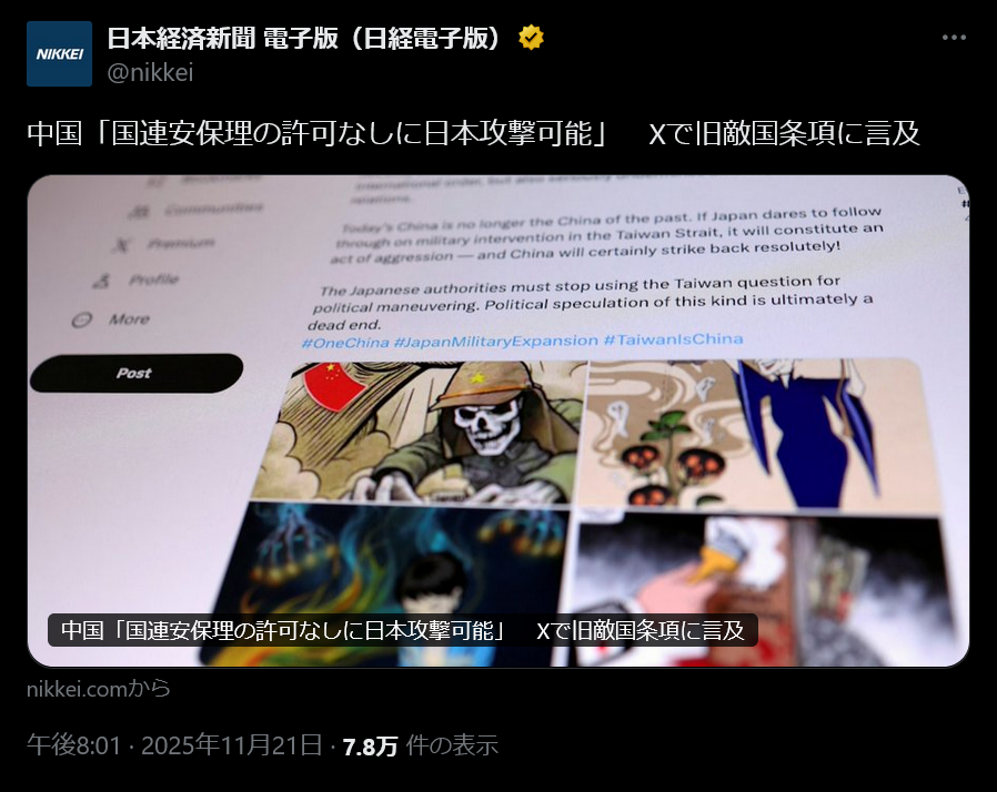 | … | 70無念Nameとしあき25/11/21(金)22:15:33No.1367744485+>中国「国連安保理の許可なしに日本攻撃可能」 Xで旧敵国条項に言及 |