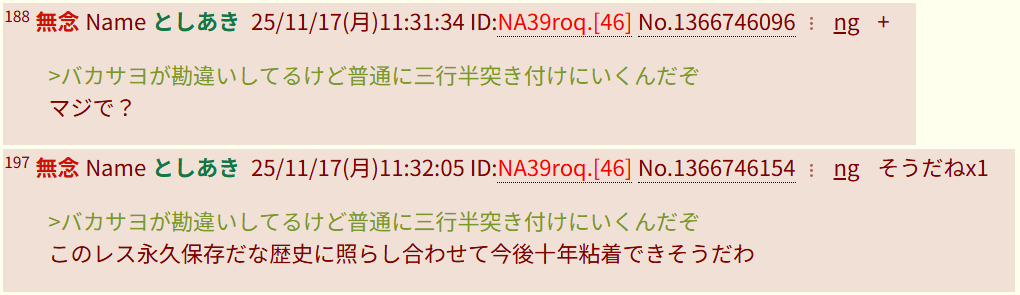 | … | 985無念Nameとしあき25/11/21(金)23:41:54No.1367769556+>なんとか言えよ |