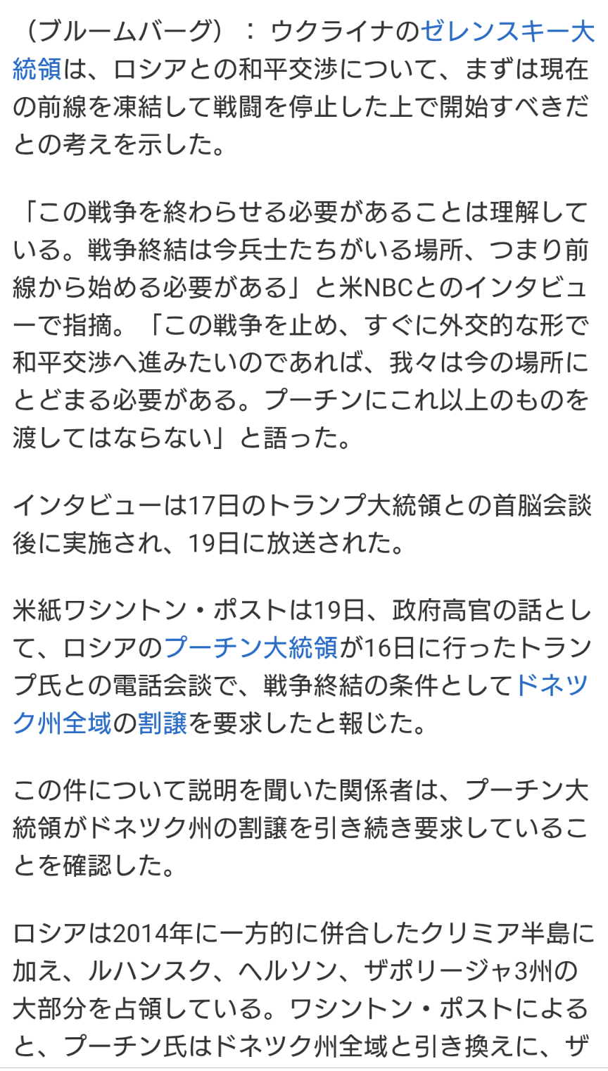 | … | 32無念Nameとしあき25/11/21(金)23:44:34No.1367770203そうだねx12>そもそもウクライナ側は今の前線で即時停戦でも構わないと言ってるのに |