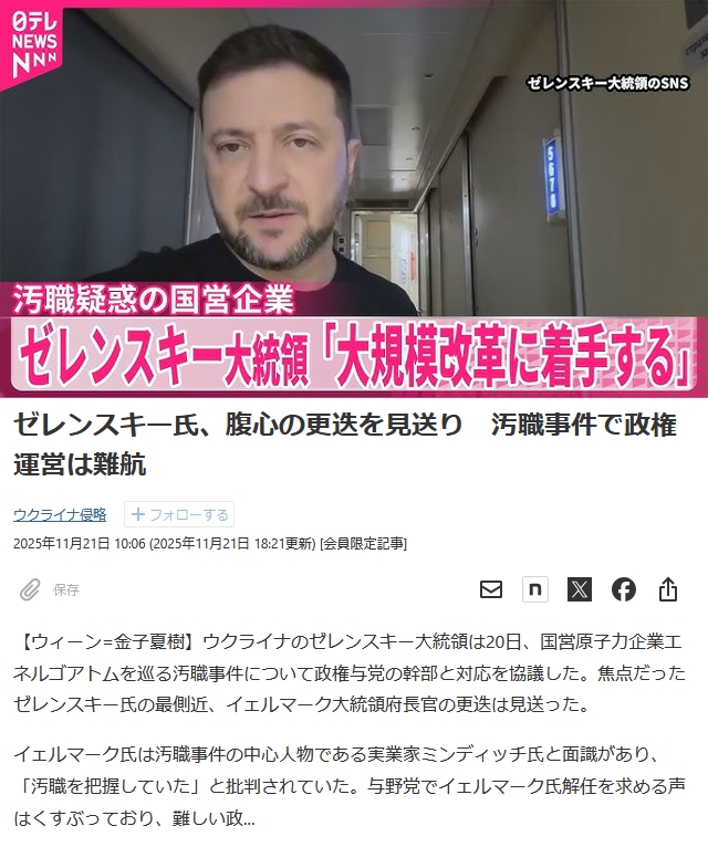 | … | 77無念Nameとしあき25/11/21(金)23:53:54No.1367772303そうだねx14 1763736834078.png-(64614 B) >そもそも支持率が2割まで下がったゼレンスキー大統領が起死回生の秘策として |