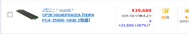 | … | 351無念Nameとしあき25/11/22(土)16:05:54No.1367900886+>半年前に8400円で買ったメモリが今は… |