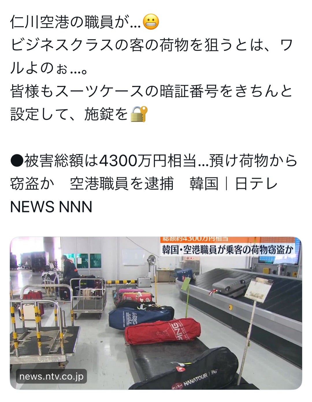 | … | 61無念Nameとしあき25/11/23(日)10:35:57No.1368096176+日本の空港利用するときは職員の盗難に気をつけないといけないのか |