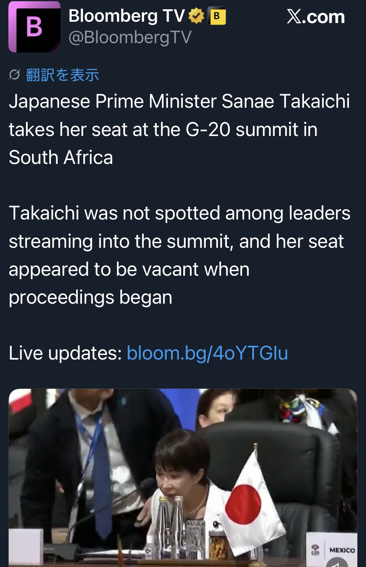 | … | 281無念Nameとしあき25/11/24(月)16:09:51No.1368432315そうだねx2 1763968191500.mp4-(5639377 B) 遅刻したとか、どの首脳からもそっぽ向かれてボッチだったとか |