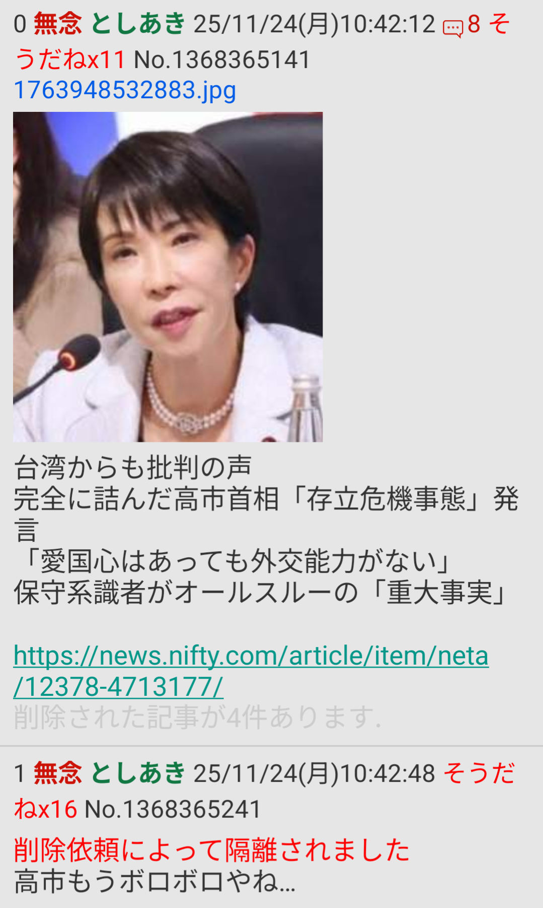 | … | 501無念Nameとしあき25/11/24(月)17:24:20No.1368448141そうだねx1>高市さんの愛国フェイスで中和しよう |
