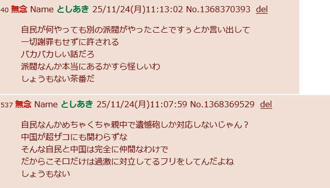 | … | 56無念Nameとしあき25/11/24(月)18:39:18No.1368465715+>自民なんかめちゃくちゃ親中で遺憾砲しか対応しないじゃん? |