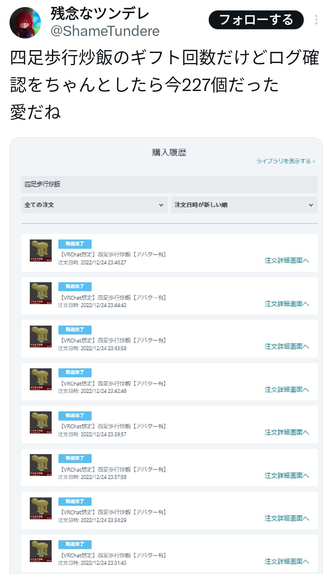 | … | 21無念Nameとしあき25/11/24(月)18:29:58No.1368463303そうだねx5 1763976598383.png-(231338 B) >四足歩行炒飯も売り上げのうち170体くらいは同じ人らしいね |