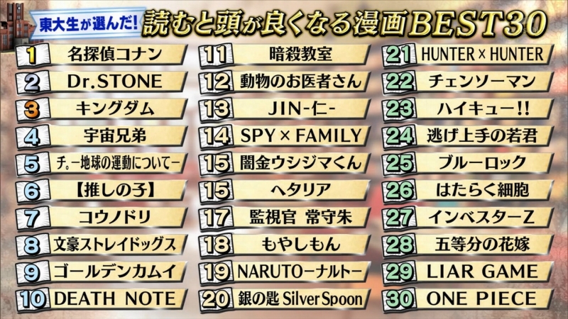 | … | 30無念Nameとしあき25/11/24(月)20:47:37No.1368506694そうだねx4>リストに入ってない漫画で〜なら勉強になるのでは、という類は東大生からすれば |