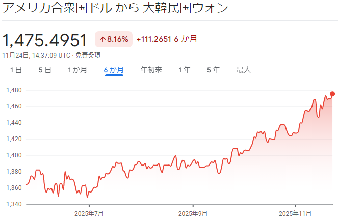 | … | 158無念Nameとしあき25/11/24(月)23:41:37No.1368558162そうだねx1 1763995297275.png-(39831 B) >いつの間にかドルウォンは1,400越えしてたのか |