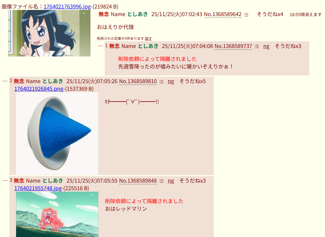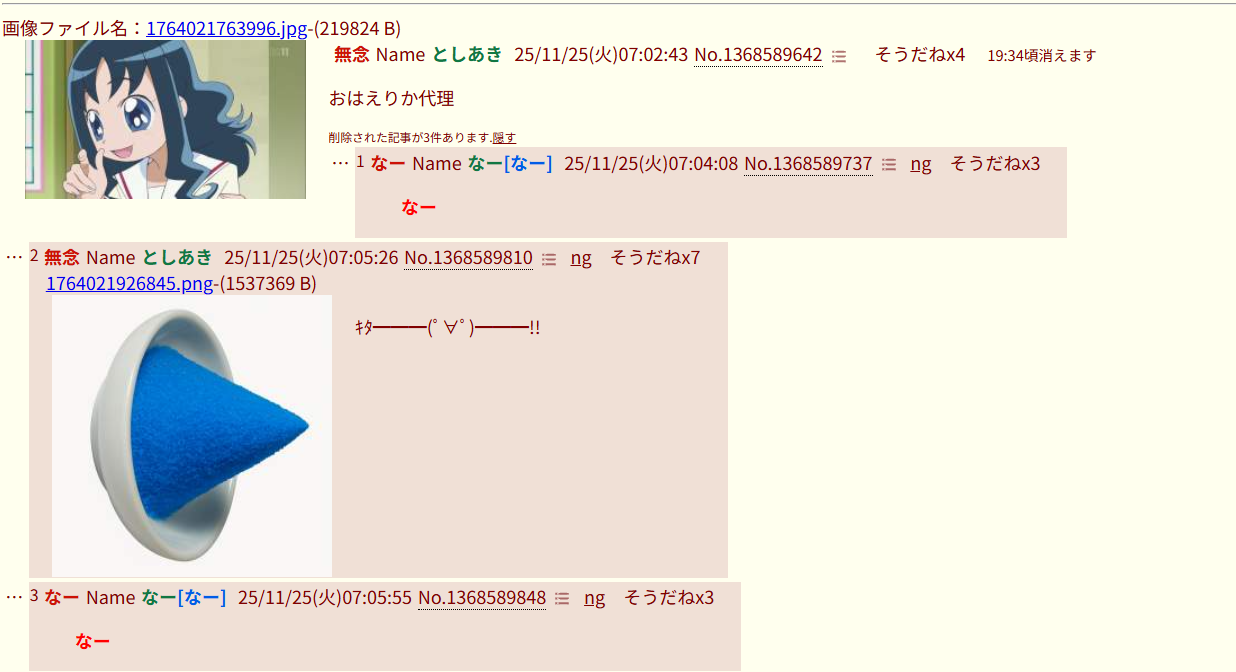 | … | 5無念Nameとしあき25/11/25(火)07:08:38No.1368590023そうだねx2おはえりか^~ |