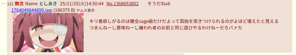 | … | 225無念Nameとしあき25/11/25(火)15:50:28No.1368662461そうだねx6 1764053428650.jpg-(25063 B) sage爺負けすぎて黙っちゃった…プププ |