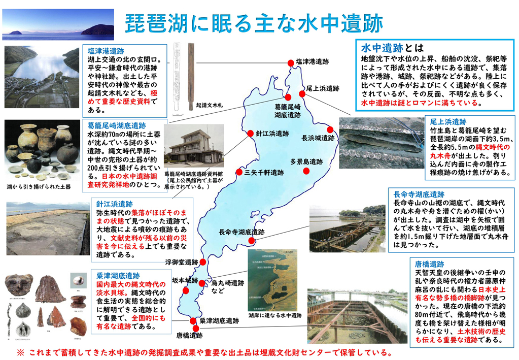 琵琶湖の葛籠尾崎の南30〜50メートル付近の水域を、東西約200メートル、南北約40メートルの範囲で探査した。海底ケーブル調査向けのシステムを文化財調査で導入し、人が潜水困難な水深30メートル以上の深い水域の地形や遺物の散布状況などを立体的に可視化した。