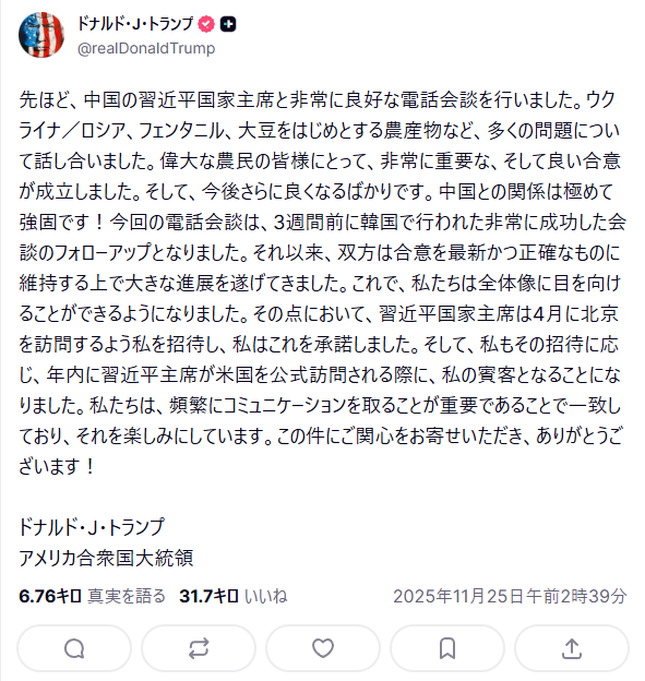 | … | 295無念Nameとしあき25/11/25(火)20:06:06No.1368717169そうだねx1前日に米中電話会談あって日本側に変に勘違いされるのも困るからの日本への報告だろ |