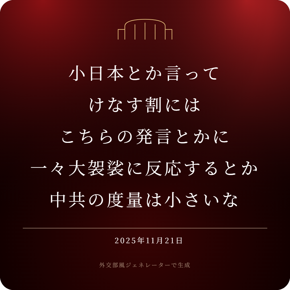| … | 328無念Nameとしあき25/11/25(火)20:43:27No.1368728781+>中国大使が書き込んだ内容即消したのは取り消して敗北したって解釈で良いの? |