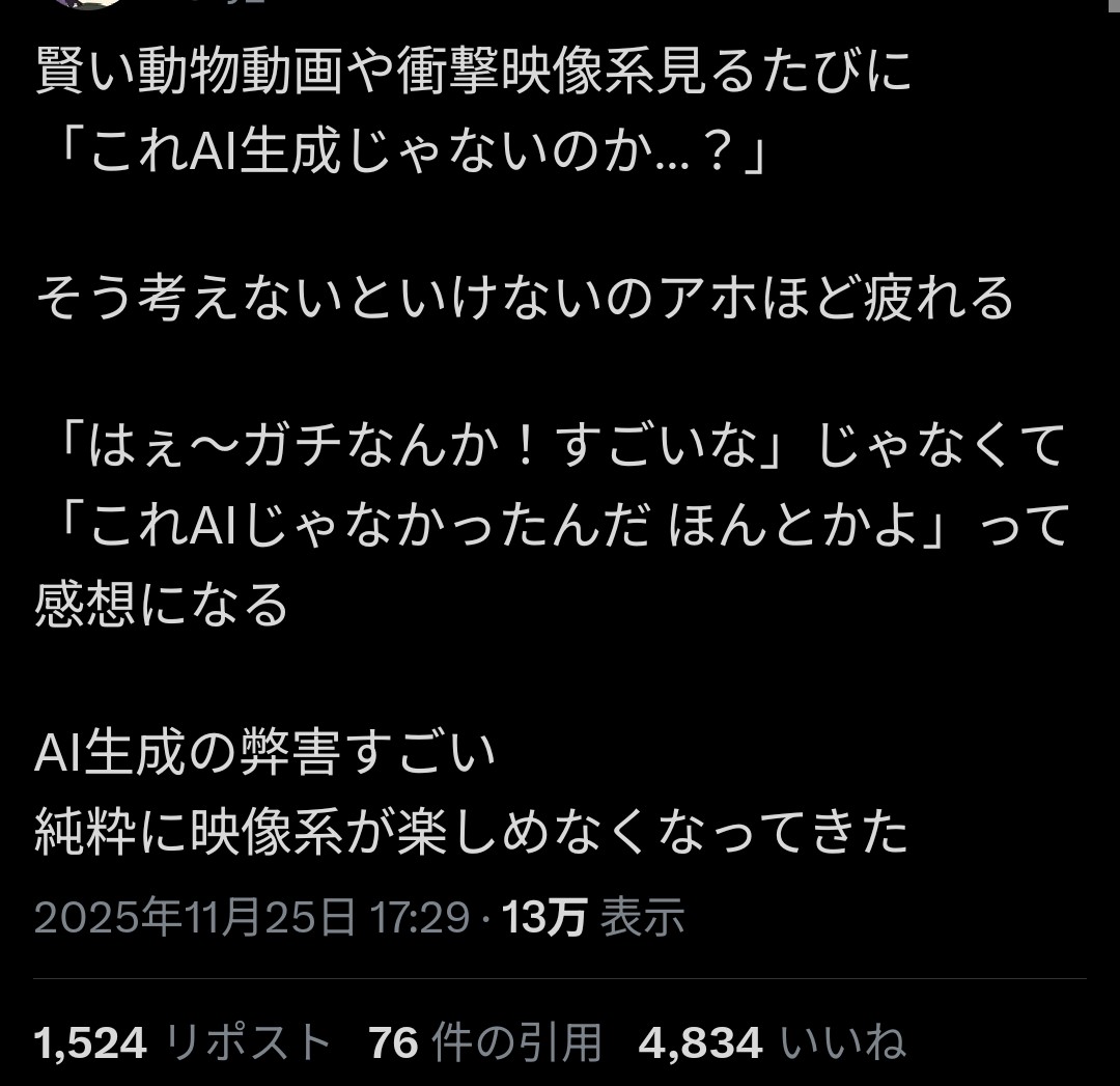 | … | 97無念Nameとしあき25/11/26(水)01:04:29No.1368790776そうだねx5>今までだってフェイク映像なんて蔓延してたのに |