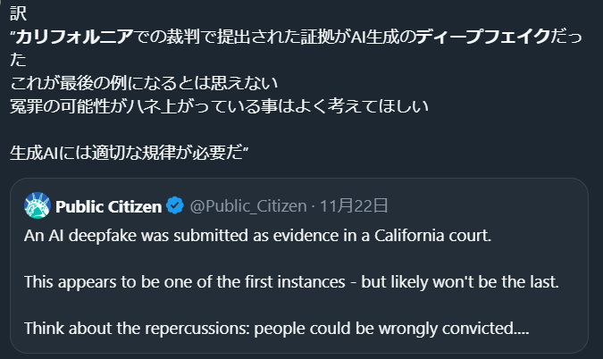 | … | 259無念Nameとしあき25/11/26(水)11:01:49No.1368835702+>どのような手法の偽造も問題になり得る中で特にAIが誰でも大量に作れるという特性を持ち合わせてることで強く非難されてるわけだけど |