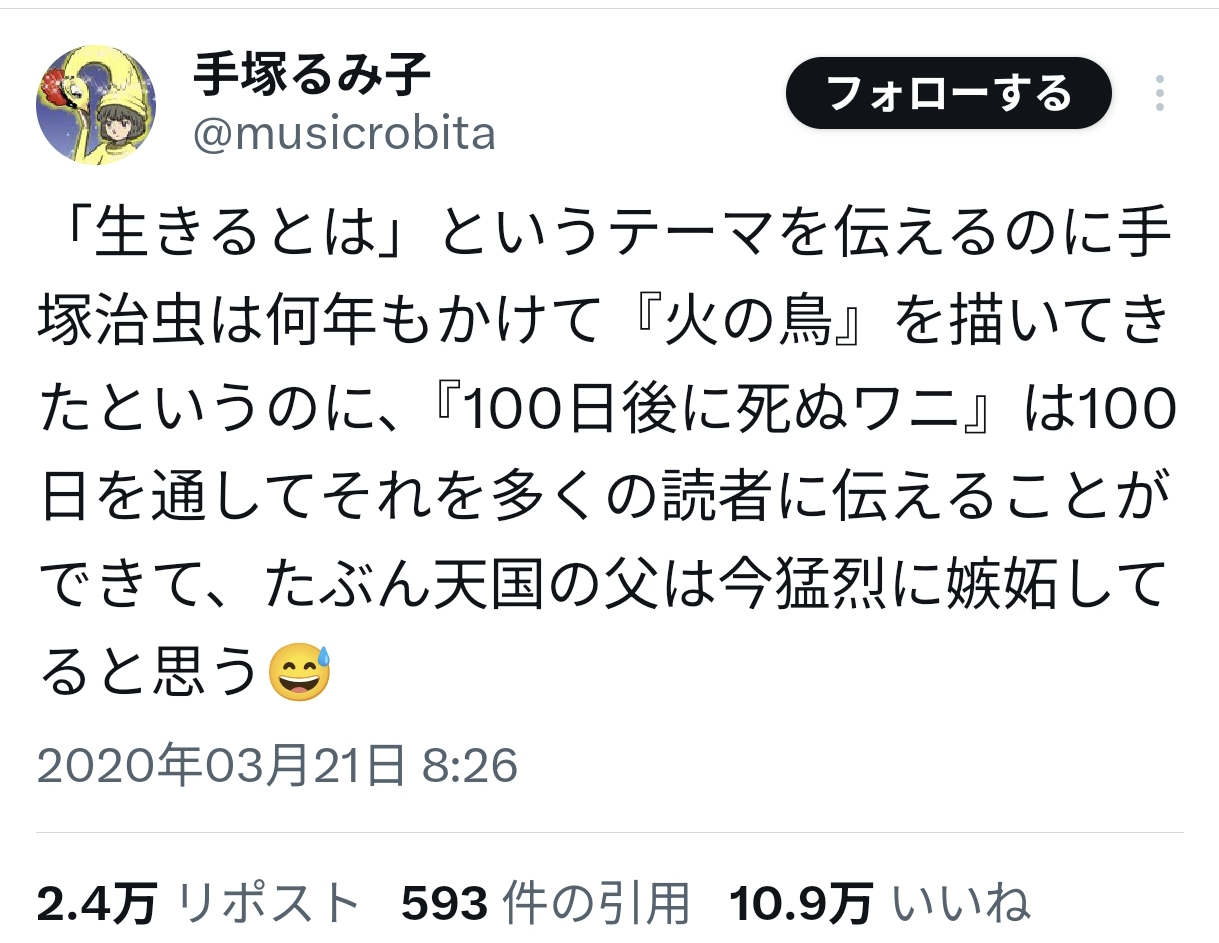| … | 10無念Nameとしあき25/11/25(火)23:00:33No.1368768226そうだねx2寿命では手塚治虫に勝った |