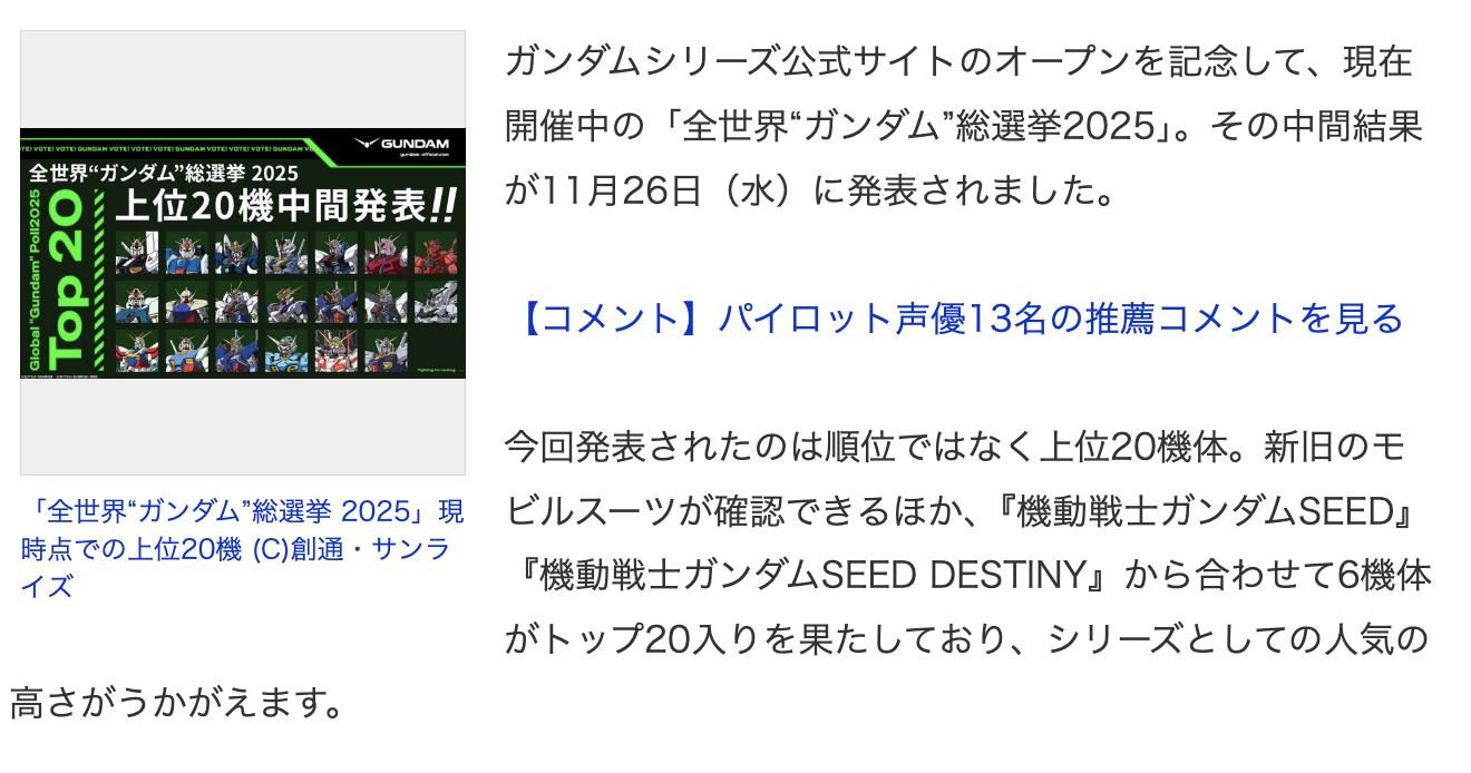 | … | 35無念Nameとしあき25/11/26(水)13:36:42No.1368860737そうだねx2この手の投票は最新のTVシリーズのガンダムとファーストガンダムがトップになるだけ何回やっても同じ |
