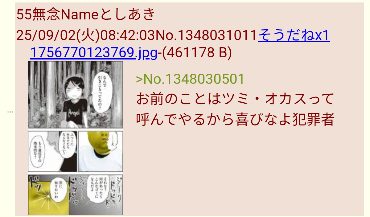 | … | 89無念Nameとしあき25/11/26(水)16:05:02No.1368885420そうだねx3>それおまえにもブーメランが… |