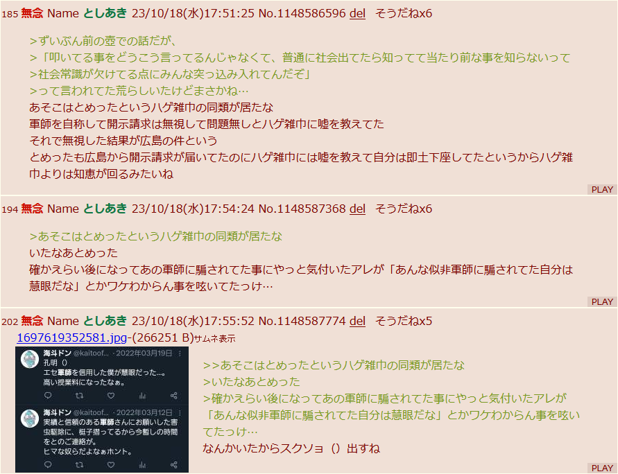 | … | 51無念Nameとしあき25/11/26(水)15:56:31No.1368884110そうだねx5>コピペ荒らしがなぜ17人衆スレに発狂するのか |